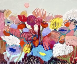 „Wildflowers“. 140x140cm. Acrylics, oil stick, oil pastels, coloured pencil on raw cotton canvas. AVAILABLE.