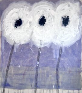 „THREE ANGEL FLOWERS“. 125x140cm. Acrylics, charcoal, oil pastel, oil stick on raw cotton canvas. AVAILABLE